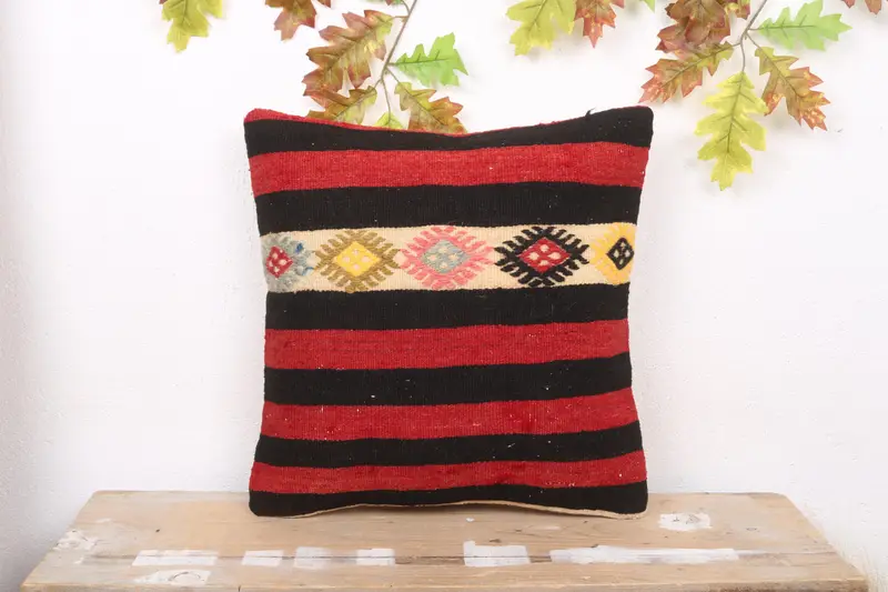 Kırmızı & Kahverengi Çizgili Kırlent, Vintage İşlemeli Kırlent