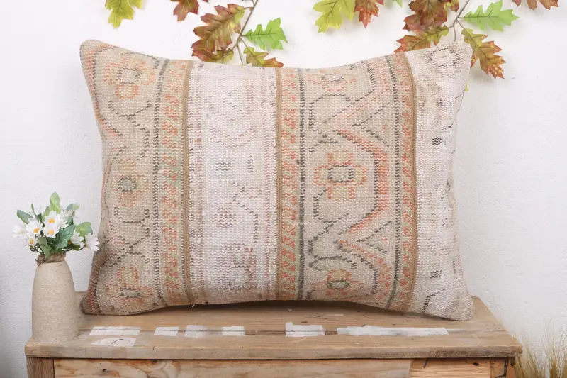 Bej ve Turuncu Patchwork Kırlent, Vintage İşlemeli Yastık