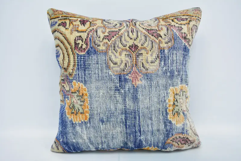 Mavi & Bej İkat Kırlent, 28x28 El Yapımı Kenevir Yastık