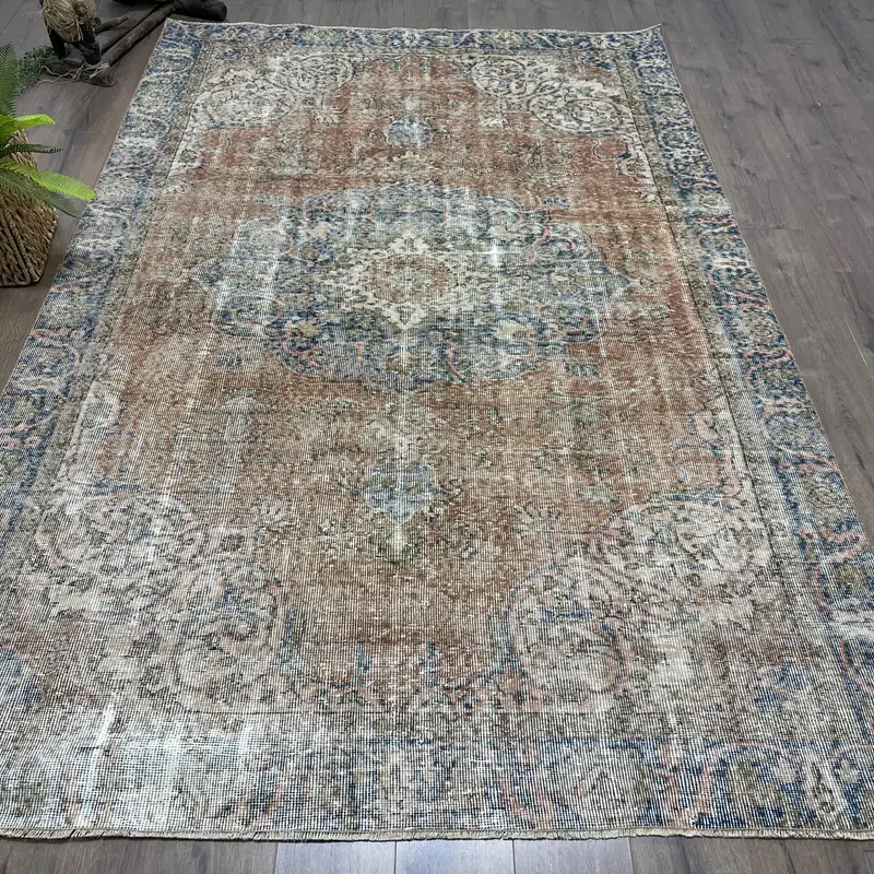 Turuncu ve Mavi Halı, 6,3x9,7 ft Geometrik Çiçek Desenli