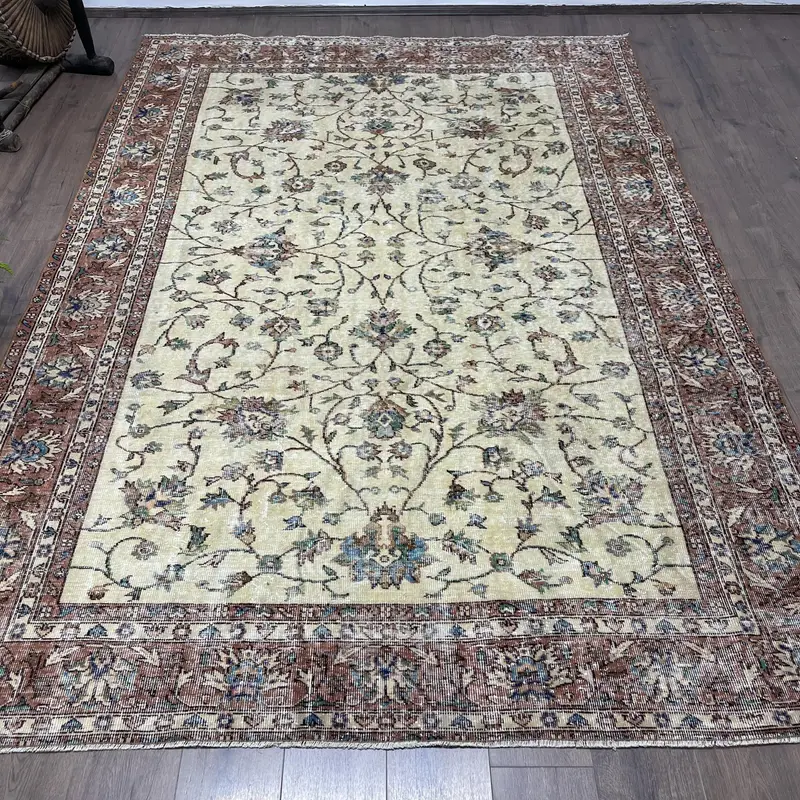 Zarif Bej ve Turuncu Halı, 6,8x9,7 ft Çiçek ve Geometrik