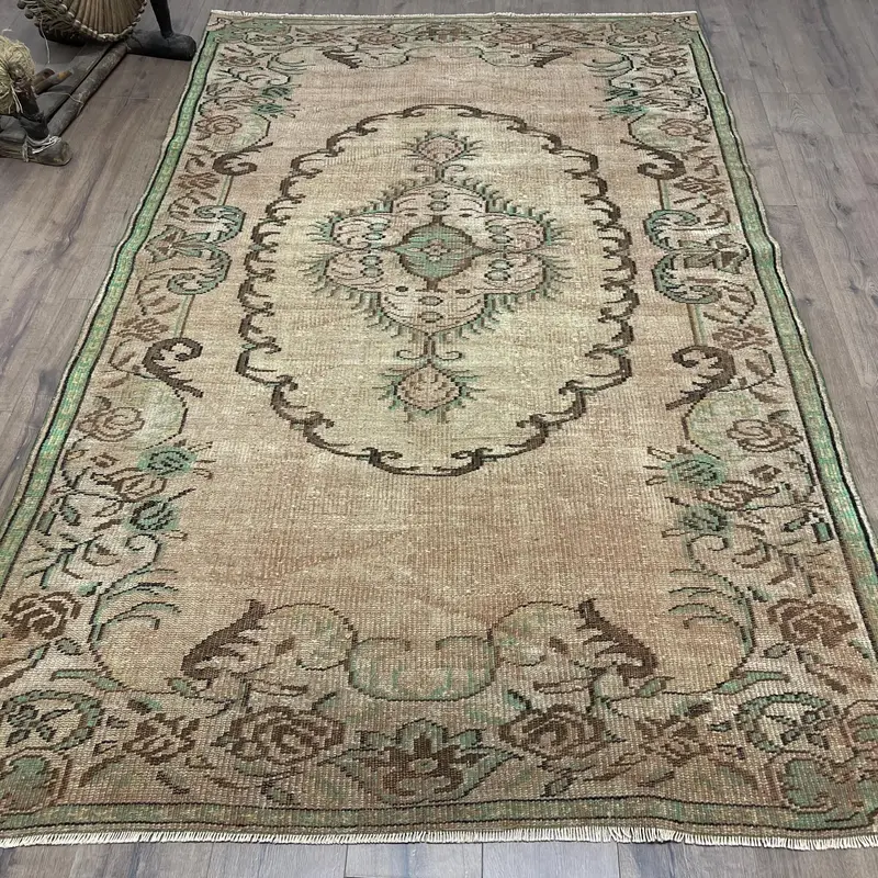 Kahverengi, Yeşil Çiçekli Halı, 5,2x8,2 ft Zarif Dekor
