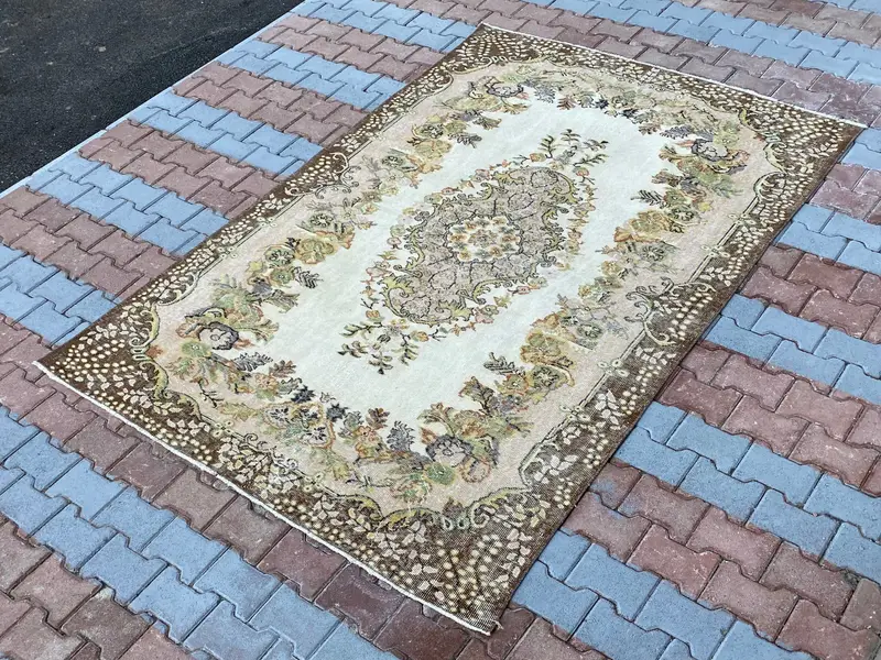 Zarif Bej ve Kahverengi Çiçekli Halı, 5,7x8,8 ft Şık Dekor