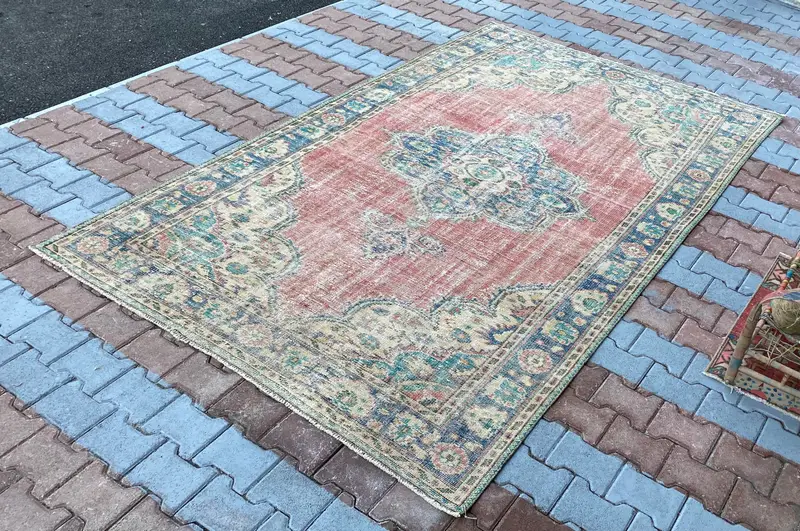 Kırmızı ve Mavi Çiçekli Halı, 6.2x9.5 ft Zarif Dekor