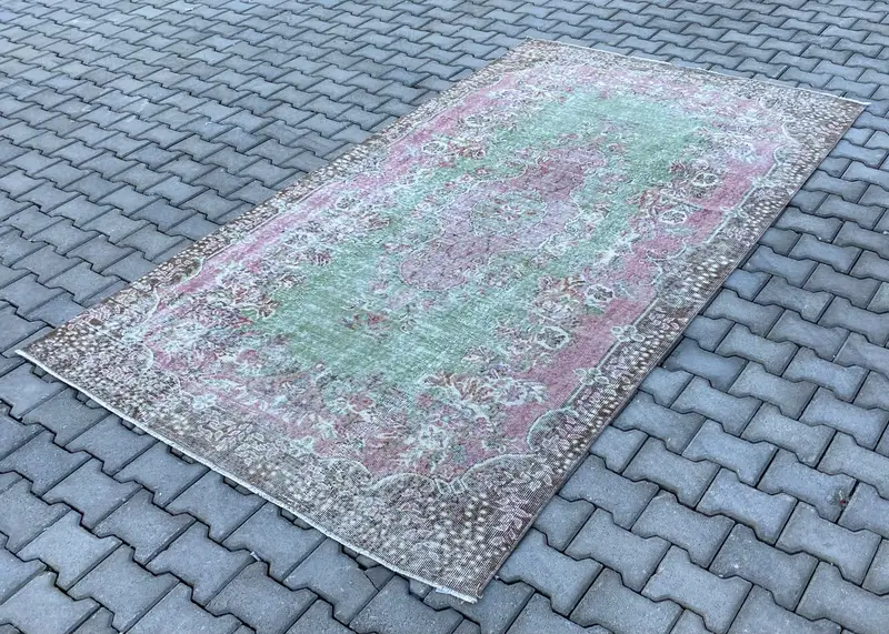 Pembe ve Yeşil Halı, 5,5x9,5 ft Çiçek ve Geometrik
