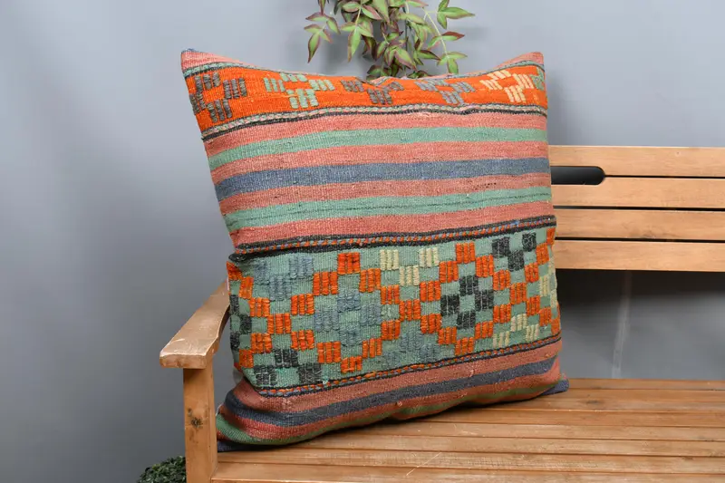 Turuncu & Bronz Çizgili Kırlent, 28x28 Nakışlı Vintage Yastık