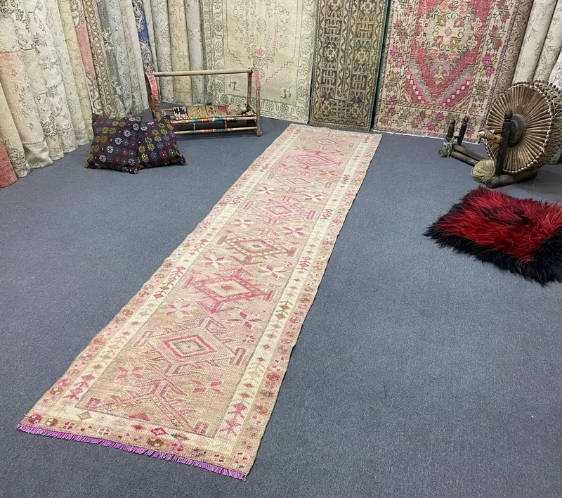 Zarif 2,6x11,5 ft Halı, Pembe ve Bej Çiçek-Geometrik