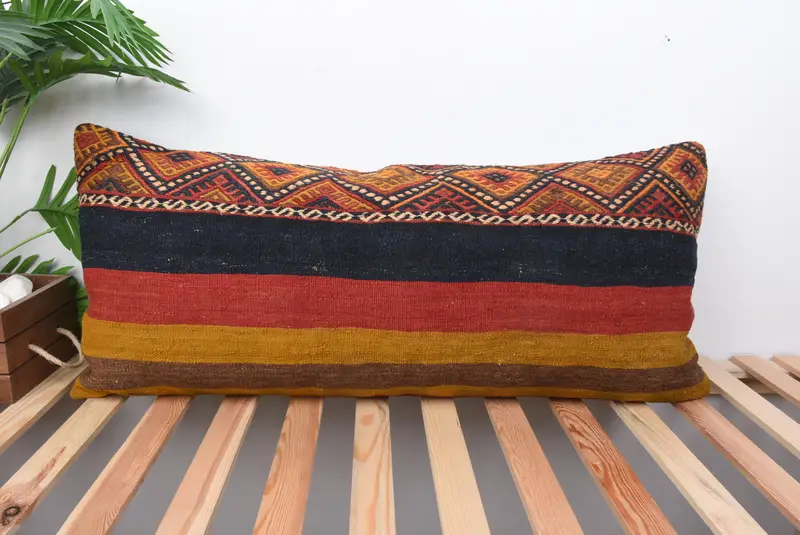 Kırmızı & Bronz Çizgili Kırlent, 16x36 Nakışlı Dikdörtgen Yastık