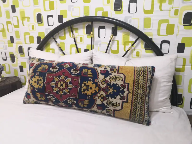 El Yapımı Mavi & Kırmızı Geometrik Yün Kırlent, Vintage Dikdörtgen Yastık