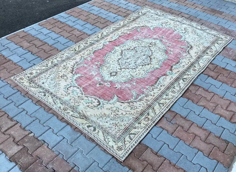 Zarif Pembe ve Bej Halı, 5,8x9,4 ft Çiçek ve Geometrik
