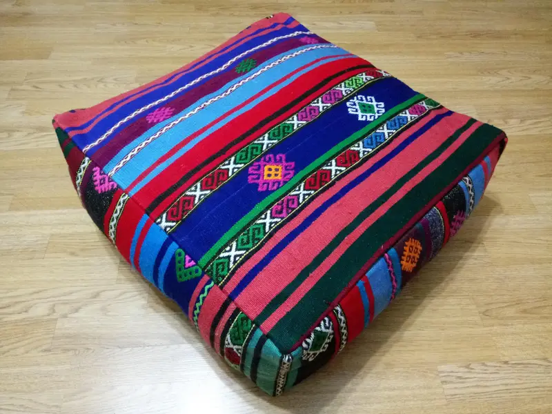 El Yapımı Mavi ve Pembe Çizgili Yün Kırlent, Vintage Kare Yastık