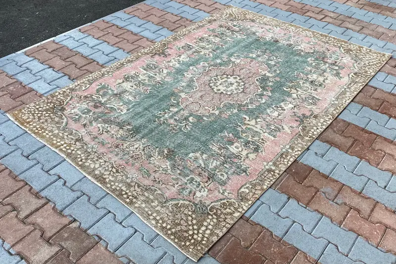 Zarif Yeşil Halı, 5,7x8,6 ft Çiçek ve Geometrik Tasarım