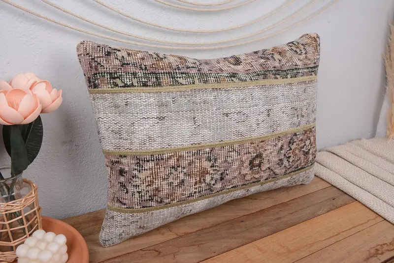 İşlemeli Patchwork Kırlent, El Yapımı Gri & Bej Kırlent
