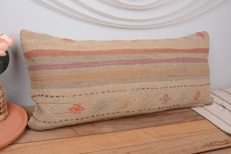 Bej & Mor Çizgili Yastık, 16x36 El Yapımı Kırlent