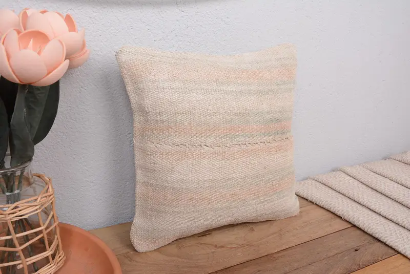 Bej & Bronz Çizgili Keten Kırlent, 12x12 Nakışlı Kırlent