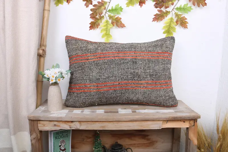Kahverengi & Kırmızı Çizgili Kırlent, Vintage İşlemeli Kırlent