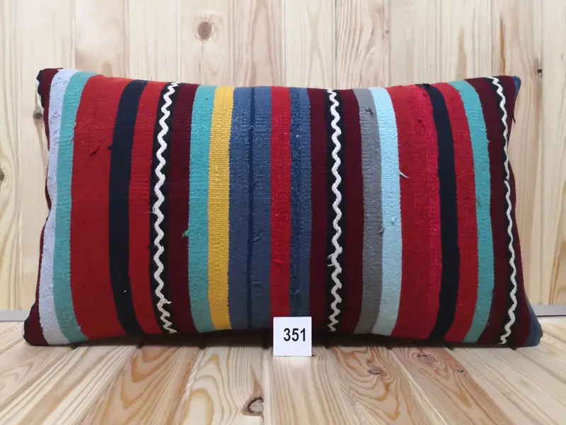 El Yapımı Çizgili Mavi & Kırmızı Kilim Yastık, 16x28 İnç Dikdörtgen Kırlent