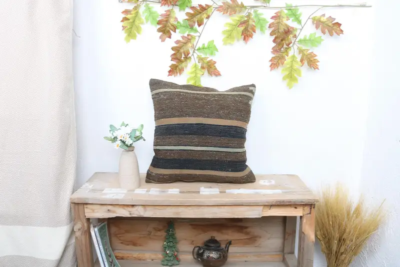 Mavi & Kahverengi Çizgili Kırlent, El Yapımı Nakışlı Keten Yastık