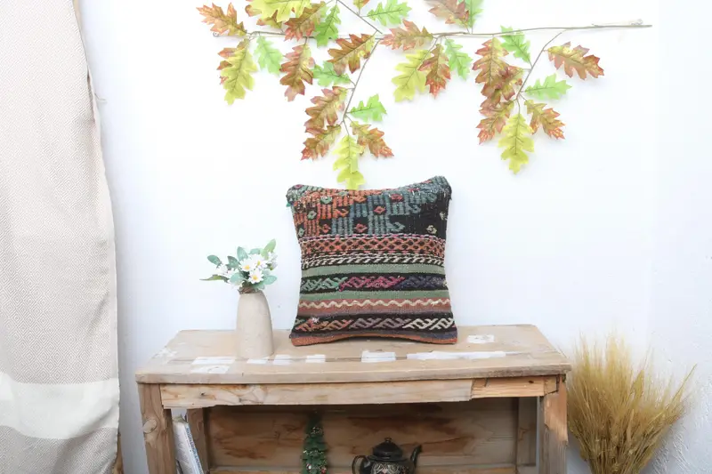 El Yapımı İşlemeli Kırlent, Yeşil & Kırmızı Geometrik Keten Yastık