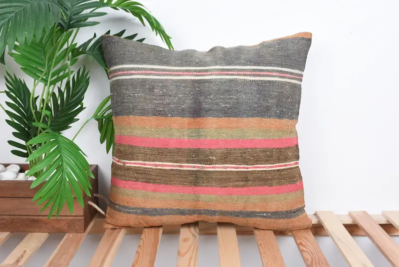 Kahverengi & Pembe Çizgili Kırlent, İşlemeli Vintage Yastık