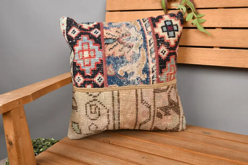 Mavi & Kahverengi Patchwork Kırlent, 16x16 Nakışlı Kırlent
