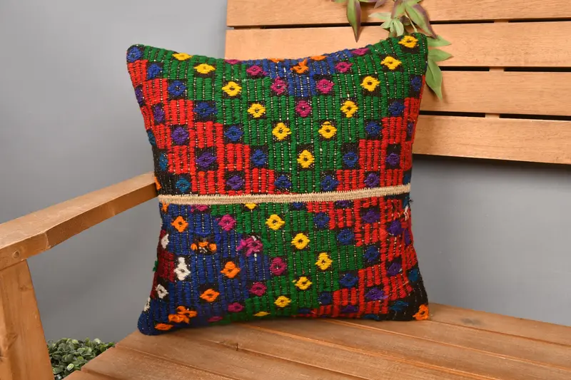 Yeşil & Kırmızı Patchwork Kırlent, 16x16 Nakışlı Kırlent