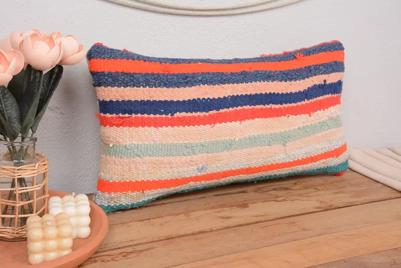 Bej & Bronz Çizgili Yastık, 24x12 Nakışlı Kırlent