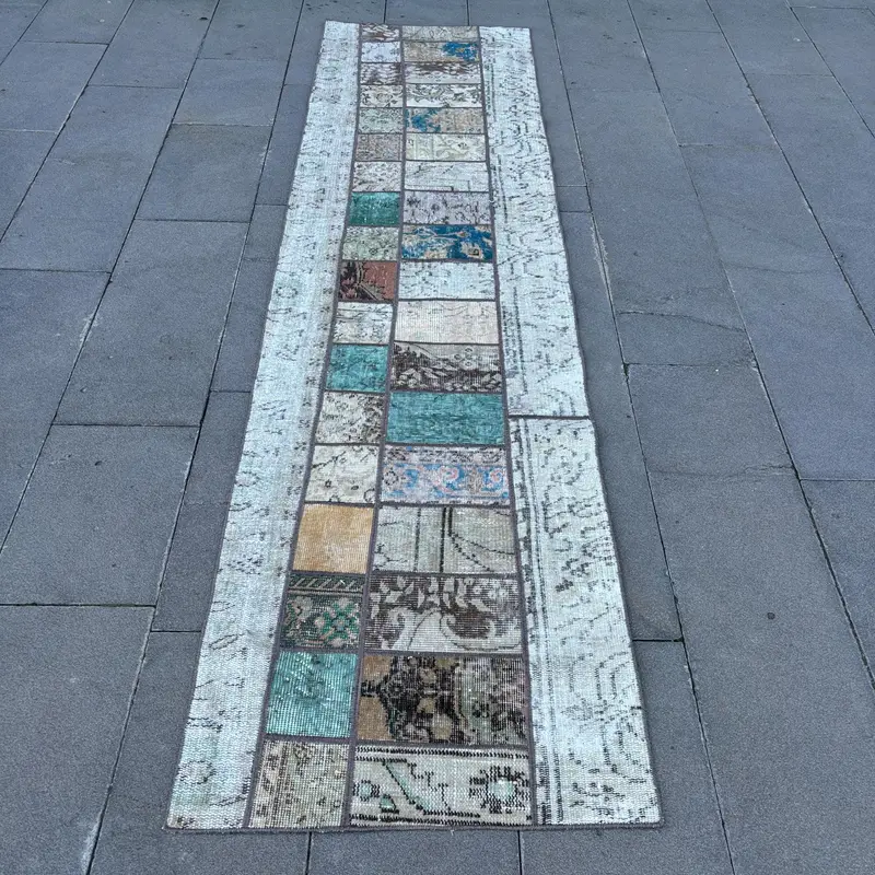 Zarif Bej Halı, Yeşil Desenli 2,4x9,1 ft