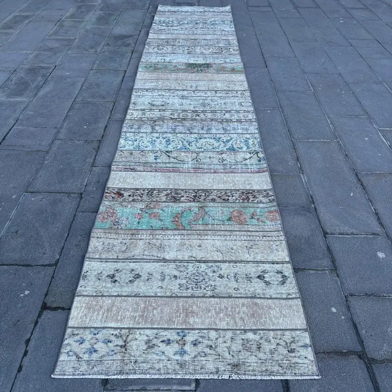 Zarif Bej ve Mavi Halı, 3x15,1 ft Soyut Tasarım