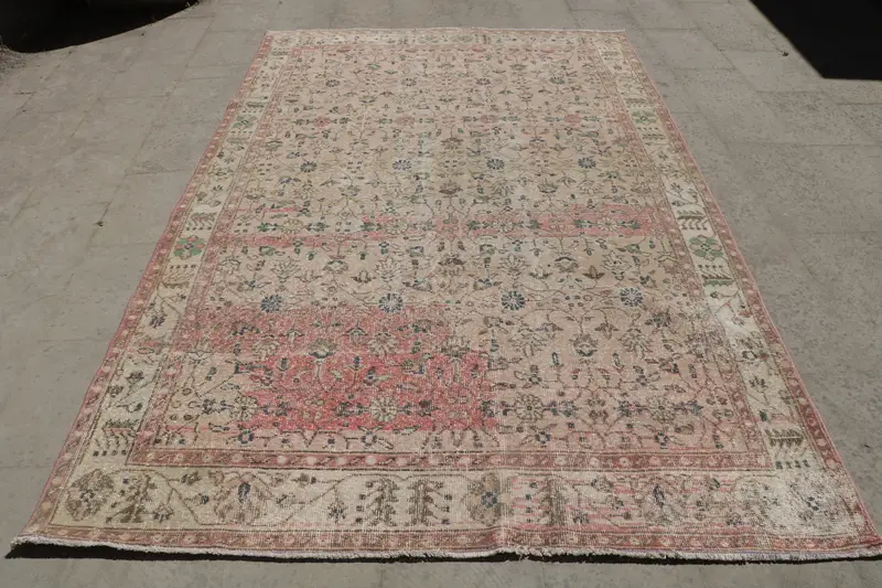 Zarif Pembe ve Bej Halı, Geometrik Çiçek Motifleri 5,6x8,8 ft