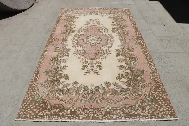 Yeşil ve Bej Halı, 5x8 ft Geometrik Çiçek Desenli