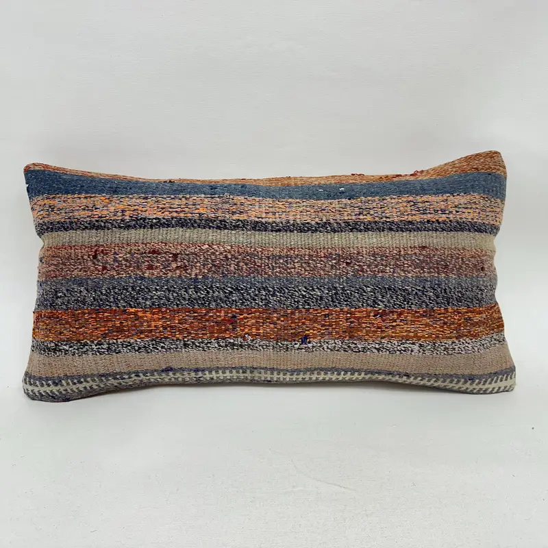 Mavi & Bej Çizgili Kırlent, İşlemeli Dikdörtgen Yastık