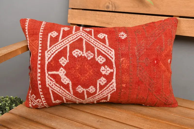 El Yapımı Güneybatı İşlemeli Kırlent, Kırmızı ve Bej Keten Yastık
