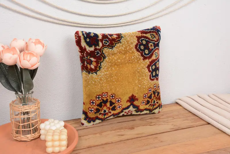 Kahverengi & Kırmızı İşlemeli Keten Kırlent, Vintage Çiçekli Yastık