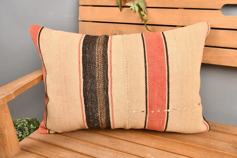 Bej&Kahverengi Çizgili Yastık, 16x24 Nakışlı Kırlent