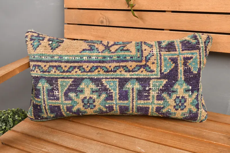 Mavi & Turuncu Çiçek Kırlent, 12x24 El Yapımı Keten Yastık