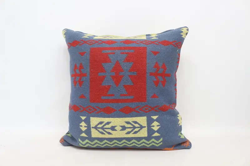 Mavi ve Kırmızı Kenevir Atma Yastık, Vintage Dikdörtgen Yastık