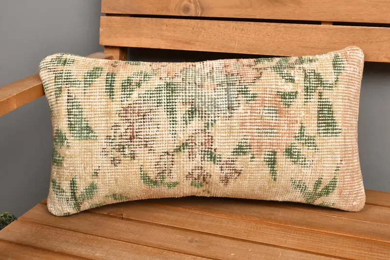 Bej & Yeşil Çiçekli Keten Kırlent, 10x20 El Yapımı Kırlent