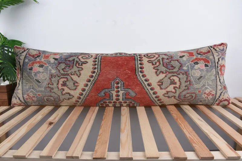 Kırmızı Yeşil Çiçek İşlemeli Kırlent, El Yapımı Dikdörtgen Yastık