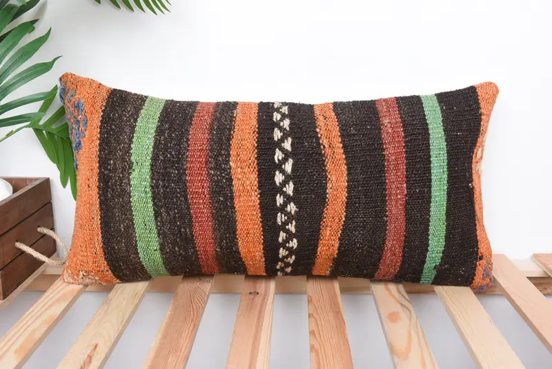 Kahverengi & Turuncu Çizgili Kırlent, Vintage İşlemeli Kırlent