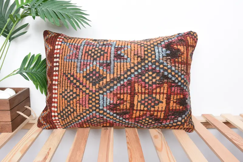 Turuncu & Kırmızı Nakışlı Yastık, 16x24 Geometrik Kırlent