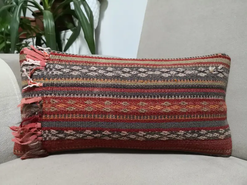 Kırmızı ve Gri Çizgili Yün Atma Yastık, 16x8 İnç Vintage Dikdörtgen Yastık