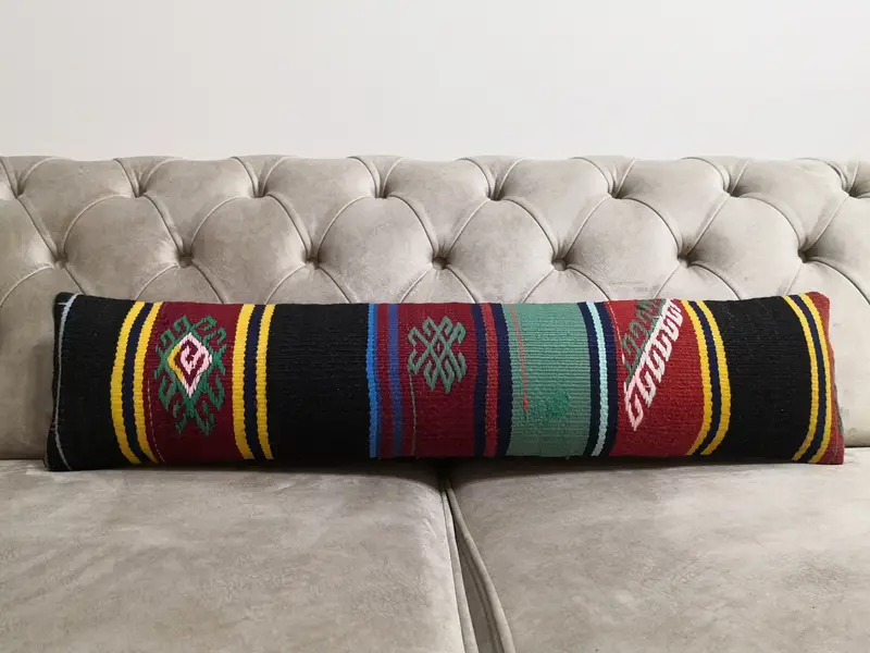 Kırmızı & Siyah Çizgili Yün Atma Yastığı, 8x36 İnç Dikdörtgen Yastık