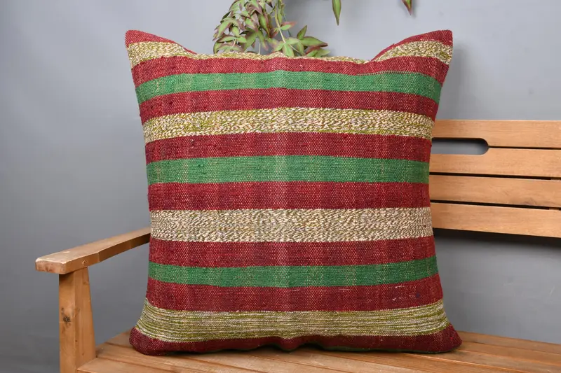 Modern Çizgili Kilim Kırlent, Vintage Yeşil & Kırmızı Kırlent