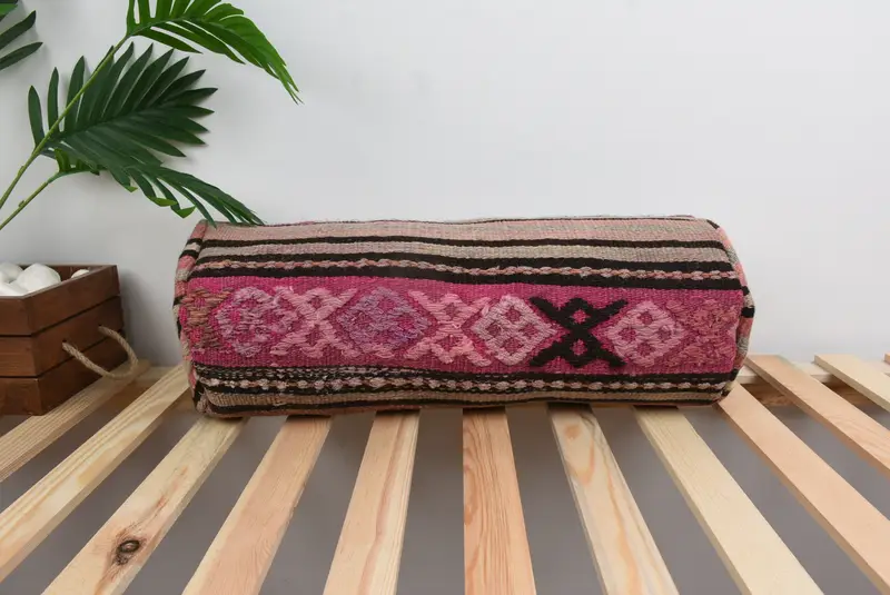 Nakışlı Pembe Kırlent, El Yapımı Pamuk Kırlent, Kahverengi, Vintage