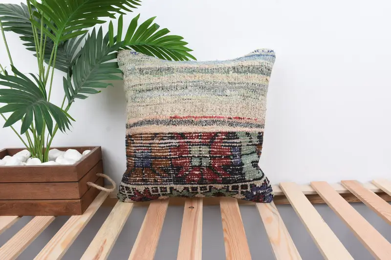 Bej & Yeşil Çizgili Kırlent, Vintage İşlemeli Yastık