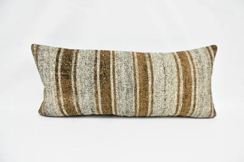 İşlemeli Dikdörtgen Kırlent, Kahverengi & Gri Çizgili Kırlent