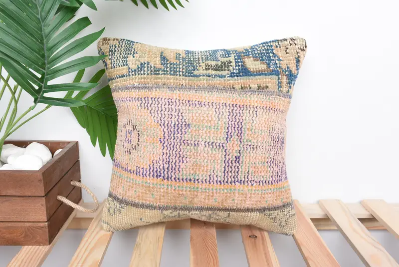 Mavi ve Bej Patchwork Kırlent, Vintage İşlemeli Yastık