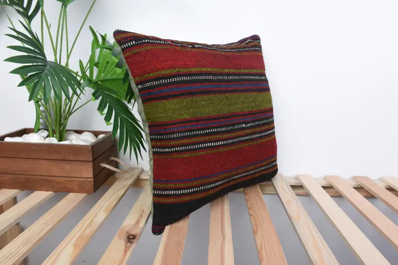 Yeşil & Kırmızı Çizgili Kırlent, İşlemeli Vintage Yastık
