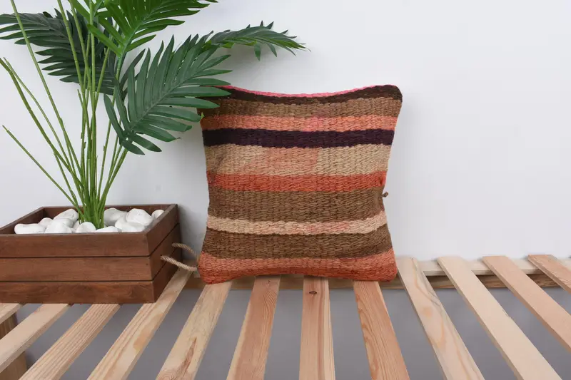 Kahverengi & Pembe Çizgili Kırlent, Vintage İşlemeli Kırlent